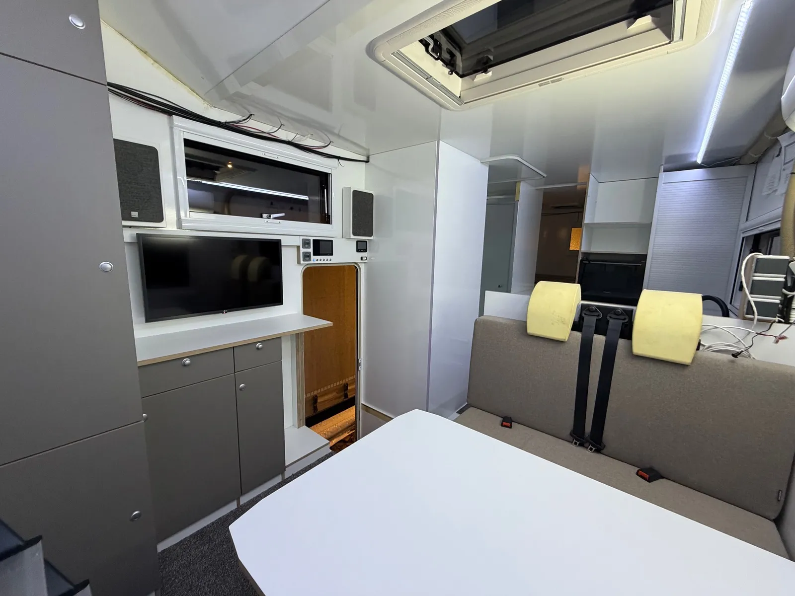 Bei meinem Konzept bekomme ich sehr viel Platz auf, für meine Verhältnisse recht kompakten, 8,30m. Ich habe 2 feste Doppelbetten mit 160cm Breite, Bad mit separater Dusche und separatem WC und einen angenehm grossen Wohnraum/Küche. Und das ganze trotz meiner 255cm tiefen Heckgarage, von den 255cm sind 185cm auf der Absenkung untergebracht und dort stehhoch (180cm).