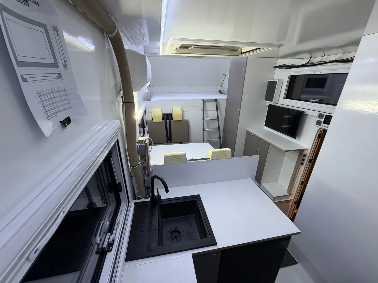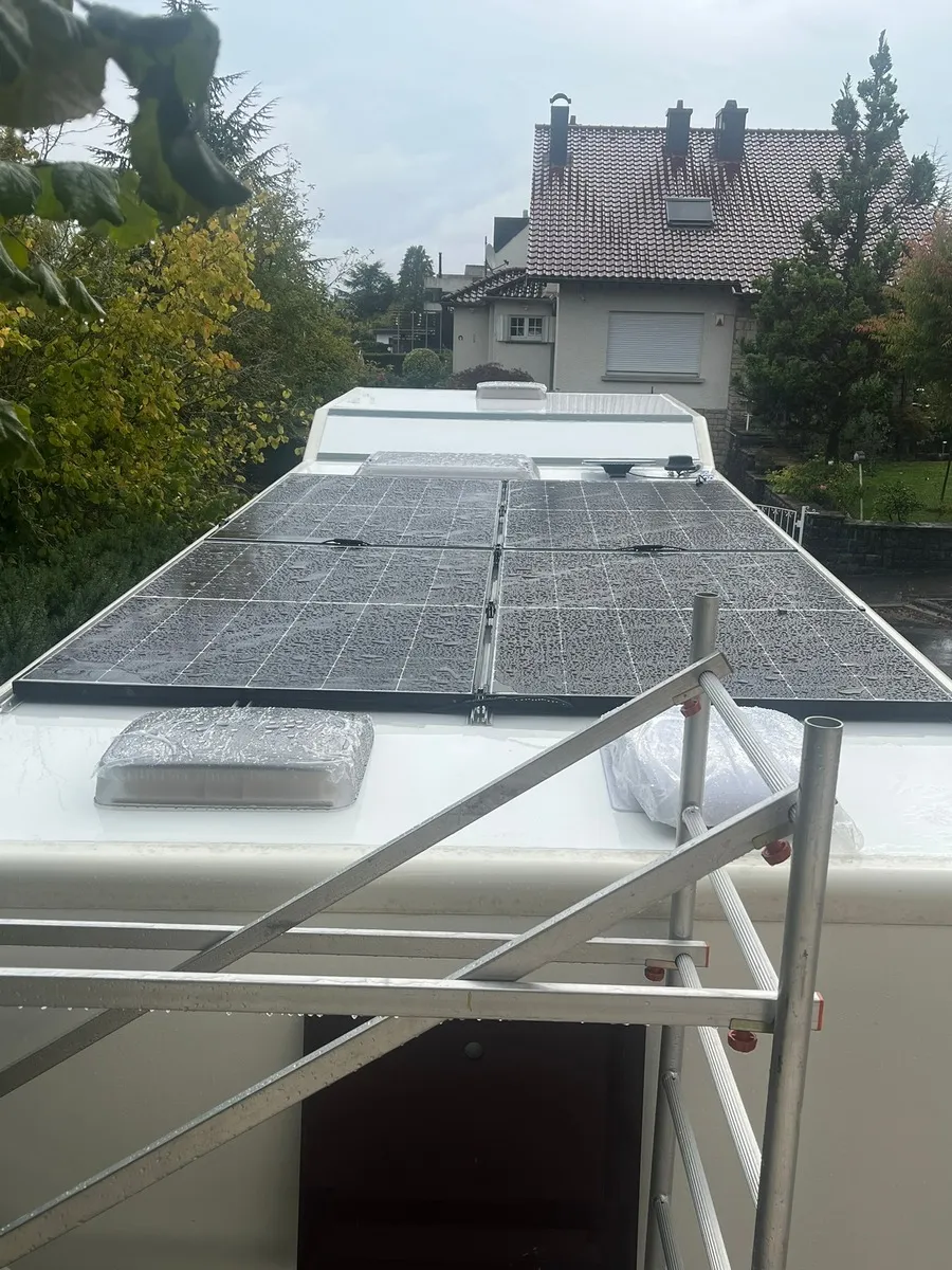 Es bleibt viel zu tun in Punkto Innenausbau und Technik. Hier noch ein Foto vom Dach, die Fotovoltaik, Dachluken sowie Starlink und 5G/Wifi Antennen sind bereits montiert und angschlossen: