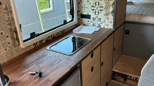 - Einbau von 3 Dachfenstern, 5 Seitenfenstern, zwei Pilotensitze von Sportscraft S10.1 mit Drehkonsole, zweite Sitzreihe mit Gurtbock, Sitzgelegenheit für 4 Personen, Festbett 150 * 200cm, Küche, Bad mit Waschbecken, Dusche und Toilette.