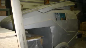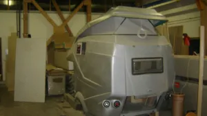 Arno Klenkhart von geocar brachte die Kabine höchstpersönlich bei mir vorbei und nachdem wir uns wegen der Transportschäden geeinigt haben ging ich an den Ausbau.Die Bilder der ersten Phase sind leider verloren gegangen und deshalb fängt die Dokumentation erst nach der Anbringung der Isolation an. Die Kabine wurde mit Fenster und Türen, dem Zeltbalg und ansonsten Leer gekauft. Zwischenzeitlich sind die meisten Möbel geschreinert, aber noch nicht lakiert.