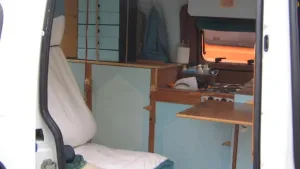 Die linke Seite ist 50 cm breit mit Schränken, Herd-Kocher-Kombinationsschrank und Gasflaschenschrank bestückt, z.T. demontierbar, Alles ist an den Leisten und an der Bodenplatte verschraubt. In der Mitte bleibt ein 50 cm breiter Gang auf die ganze Länge frei. Auf der rechten Seite befindet sich der Schrank, der tags das Bettzeug aufnimmt, und ein Sitzplatzkasten mit Rollen, auch ca. 50 cm breit. Beides wird nachts zur 1m breiten und 1.80 m langen Liegefläche, einschliesslich des variabel einsetzbaren kleinen Tisches, der tagsüber an mehreren Leisten an der Möbelseite eingeklemmt werden kann und mit einem herausnehmbaren Metallfuss abgestützt wird. Die Tischplatte lässt sich auch an der geöffneten Hecktüre mittels Schnüren so befestigen, dass er als Aussentisch dient. Der Sitzplatz kann in diesem Fall die Hecktürschwelle oder ein Stuhl drausssen sein. Eine mittels Türscharniere aufklappbare Schranktüre lässt sich ganz herausnehmen und als zweiten noch kleineren Tisch einsetzen. Auch er hat eine Vorrichtung für den Tischfuss.