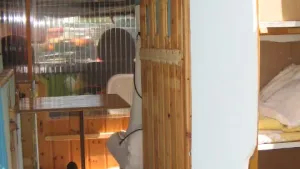Das Trenngitter zum Fahrerraum wurde entfernt und stattdessen eine seitlich von Holzplatten begrenzte grosse Durchgangstür aus doppelter Plexiglasplatte zum Aufklappen geschaffen, die im Winter kältedämmend wirken soll und viel Licht in den Wohnraum durchlässt.