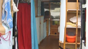 Der Kleiderschrank links hinten ist zum Mittelgang nur mit einem Vorhang geschlossen und auch von der geöffneten Hecktüre zu bedienen. Ein Kleidungsstauraum mit Fächern befindet sich auf der rechten Seite am Heck hinter dem Bettschrank. Er geht auch bis zur Decke und ist von drei Seiten zu erreichen, vom Heck, vom Mittelgang mittels Tür, vom Bett aus mittels Klapptüren je Fach.