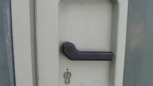 Eine Seitentüre (Maß 180 x 55 cm) mit Dreipunktverriegelung, Griffschale