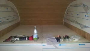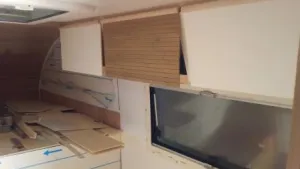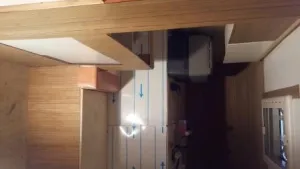 Der Alkoven hat wirklich eine Bettverlängerung. Auf dem Bild mit der Sitzecke sieht man das. Es ist ein Brett, das im Tagesbetrieb nach oben geklappt wird (da fehlt noch die Bambusverkleidung).