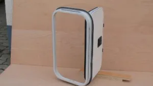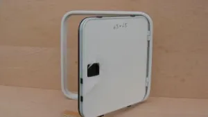 Alurahmen weiß mit gerundeten Ecken, (r = ca. 80) innen liegende Gummi Hohlprofildichtung, ca. 30mm geschäumter Füllung. (Kunstoff genarbt / PU / Alu glatt) Versenkter Klappverschluß, (noch ohne Schlieszylinder) Schlieszylinder (auch Gleichschliesend) sind bei jedem Campinghändler zu besorgen