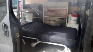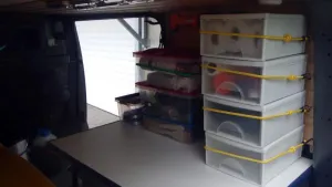 Nun hat es links einen ganz normalen Lattenrost mit Matratze. Darunter 30 cm hohe Stützen (von Hornbach) dran geschraubt. Rechts der Campingtisch mit dickem Draht rüttelfest befestigt. Dazu noch den ganzen Gerümpel, was man halt so für einen improvisierten Haushalt braucht. Die vier Kunststoffboxen unter dem Bett sind bewusst noch leer.