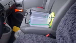 Vorne hat es am Boden einen Abfallkübel, eine Fliegenklatsche und auf der Sitzbank eine Box für all die 1000 Kleinigkeiten, die sonst so rumschwirren. In zwei Bidonhalter (für Fahrräder) finden kleine PET-Flaschen ihren Platz. So muss ich während der Fahrt nicht verdursten.