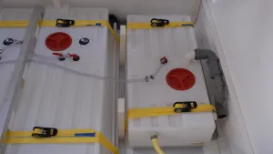 weiter geht es mit dem Innenausbau. Hier ein paar Bilder mit den Wassertanks. Die beiden inneren sind für Frischwasser vorgesehen (2x75L) und die beiden äußeren für Abwasser (2x61L). Ich habe darauf geachtet, fast alles mit üblicher Haustechnik zu installieren. Also z. B. HT-Rohre und Einhebelmischer für die Wasserentnahme.