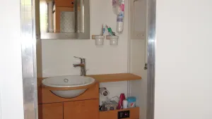 Da die Duschtasse tiefer lag, als der Einfüllstutzen für das Abwasser, fließt das Duschwasser erst in einen Behälter und wird mit einer Automatik Bilgenpumpe in den Abwassertank gepumpt. Unter Segelzubehör/Bootszubehör bekommt man das benötigte Material. Ein Rückschlagventil zw. Duschtasse und Behälter nicht vergessen. Da immer etwas Wasser im Behälter bleibt, fließt dieses natürlich bei einer Bergabfahrt wieder aus dem Duschablauf in die Duschtasse.