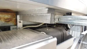 Hinten in der Garage habe ich Zurschienen an den Wänden und auf den Boden geklebt zur Ladungssicherung. Durch das Anbringen der Zurschienen an vielen Stellen in der Garage, bin ich sehr flexibel mit der Befestigung von Gegenständen. -