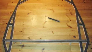Gestern habe ich Stahlrohr geschnitten für den vertikalen Anschlussrahmen genau nach der Holzmodelle die ich am Auto ausgemessen habe. Das kleine Stückchen in der Mitte ist das einzige das ich übrig hatte von 10 Meter Rohr.