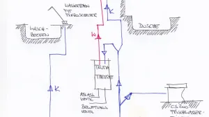 - Nach der Tauchpumpe zweige ich einen Teil zu der Therme ab, den anderen zum Mischer. Das Warmwasser kommt von der Therme auch zum Mischer und danach zu eine, Stellbrausknopf. Da wieder das selbe Dilemma, die Pumpe mache ich vor dem Duschen an und läuft tlw. ein paar Minuten ohne dass Wasser entnommen wird, macht das was ?