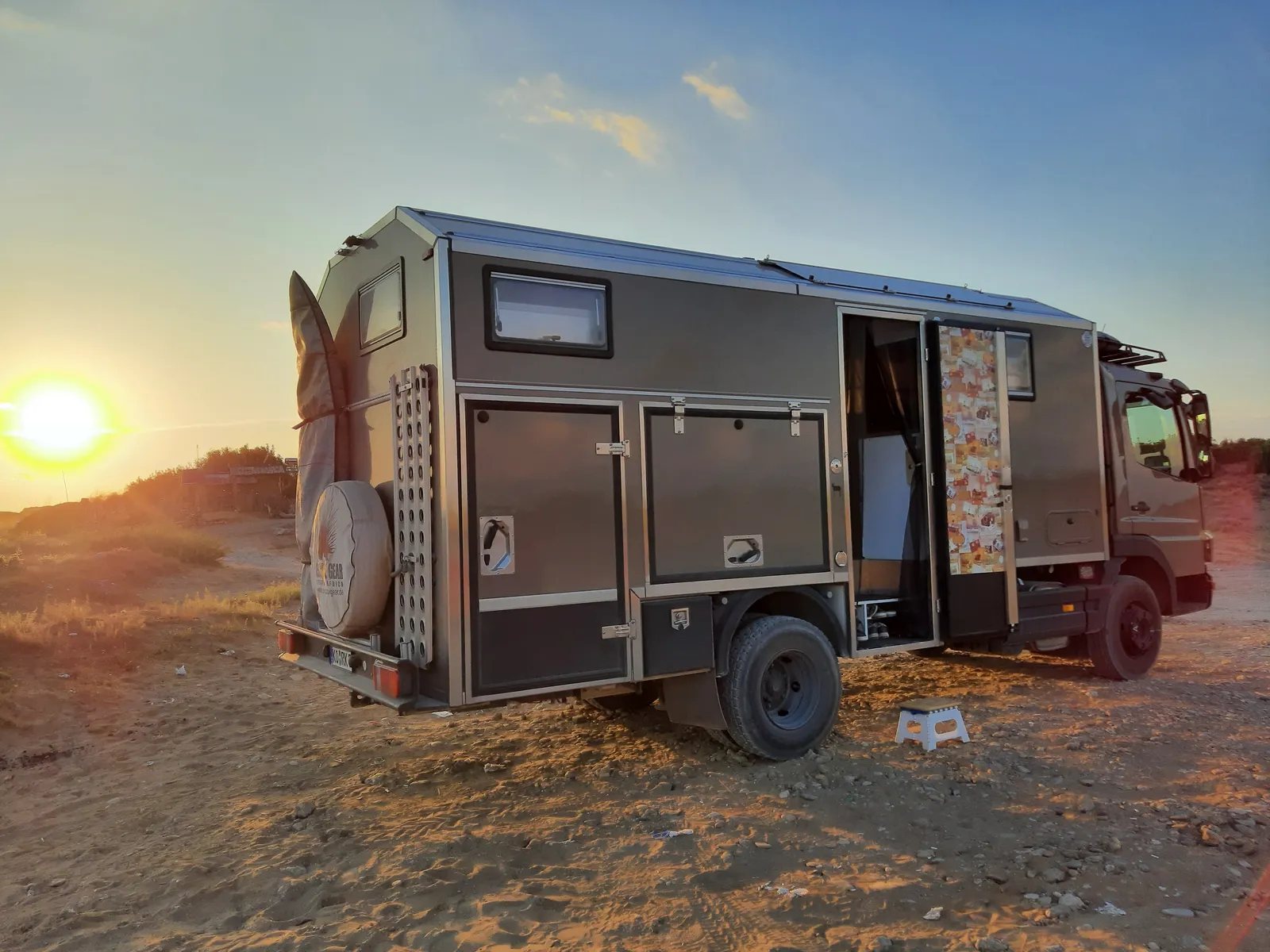 Reisefertig mit sehr viel Sportgepäck, 230Kg Roller, 200L Diesel, 200L Wasser, Ersatzrad, viel Werkzeug und unmengen sonstigem Geraffel vom Sandblechen bis Hebekissen 7,6t.