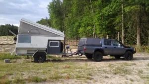 Explorerkabine (Fa. Knaus) für 1 ½ Pickup konzipiert, auf Anhänger (Spezialanfertigung) montiert.