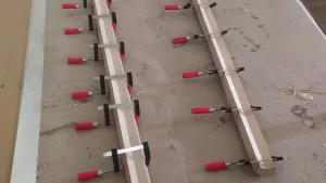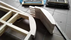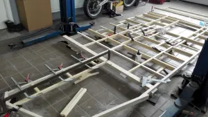 Wir hatten unsere beiden Osterurlaubswochen genutzt, um das fertig gebaute Dach sowie die Seitenteile mit der Pappel-Innenverkleidung zu verkleben. Nach einigen Recherchen haben wir uns für eine günstige Variante einer Vakuumpressung entschieden und entsprechend gebaut.