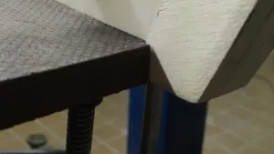 Nachdem die Presse und das Dachelement neu gebaut waren, ging es mit einem Malervlies als Unterlage an die erste erfolgreiche Verklebung. Inzwischen haben wir die Bodenplatte, das Dach und die beiden Seitenwände mit der Innenverkleidung erfolgreich verklebt - und dank dem Vlies auch wieder ohne Probleme von der Presse nehmen können.