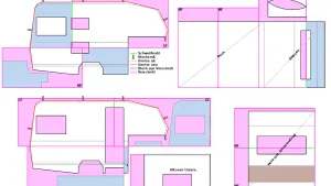 Derzeit zerbrechen wir uns noch den Kopf, wie wir die vier vertikalen Stöße (grüne Linien) der Außenhaut kaschieren können. Die Stöße sind im sichtbaren Bereich und Blenden bzw. Leisten würden optisch nicht zum Aufbau passen. Wenn jemand eine Idee oder Erfahrungen dazu hat wären wir sehr dankbar.