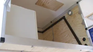 Neue Taten: Der Doppelboden für den Sitzbereich ist eingebaut, wie Ihr an folgendem Bild bei offener Rückseite sehen könnt. Unter dem Doppelboden sollen die Außenmöbel, die Einstiegstreppe (wahrscheinlich) für hinten, der Gasgrill und solche Sachen verschwinden. Es fehlen hinten nur noch der Teppich, die Gardinen und die Drehstühle. Ansonsten bin ich im hinteren Bereich fertig. -