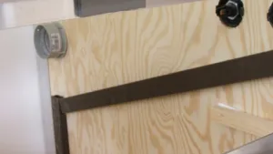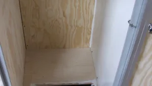So, nun war die Küche drann. Küche bedeutet: Der gleich sichtbare Schrank, 90cm breit, 70cm tief, wird oben den Einschnitt für die Spüle mit Kocher mit Glasplatte bekommen. Im Schrank sind links der Gaskasten, rechts wird die Truma C 4002 stehen. Hinter den Gaskasten kommt direkt vor die Außenwand ein ein Abwasserkanister, vor dem Kanister werden zwei Luftrohre die Warmluft in den hinteren Fußraum und per Verlängerung in den Mittelgang blasen. Eine dritte Öffnung leitet Luft nach vorne (seitwärts, rechts im Schrank bei den folgenden Bildern zu sehen. Im Bild schon zu sehen ist die Gasfallöffnung.