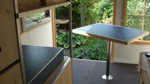 Vielleicht noch ein Wort zum letzten Bild: Ich wollte den Tisch verschwinden lassen, wenn wir Platz brauchen. Deshalb die Lösung: Tischplatte an die Seitenwand in den Doppelboden eingelassen und ebenfalls das Tischbein. So sind beide Teile auch während der Fahrt gesichert.