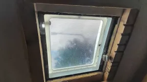 Eingebaut sind ein größeres Seitenfenster, verdunkelt zum Aufstellen, und ein kleines Dachfenster - da flog mir irgendwann das teure Dometic-Fenster ab, nachgeschustert wurde ein billiges gerade verfügbares Fenster, für welches die Innenverkleidung nicht an meinem recht dicken Wandaufbau hält; daher innen derzeit unverkleidet, Teile stehen im Auto.