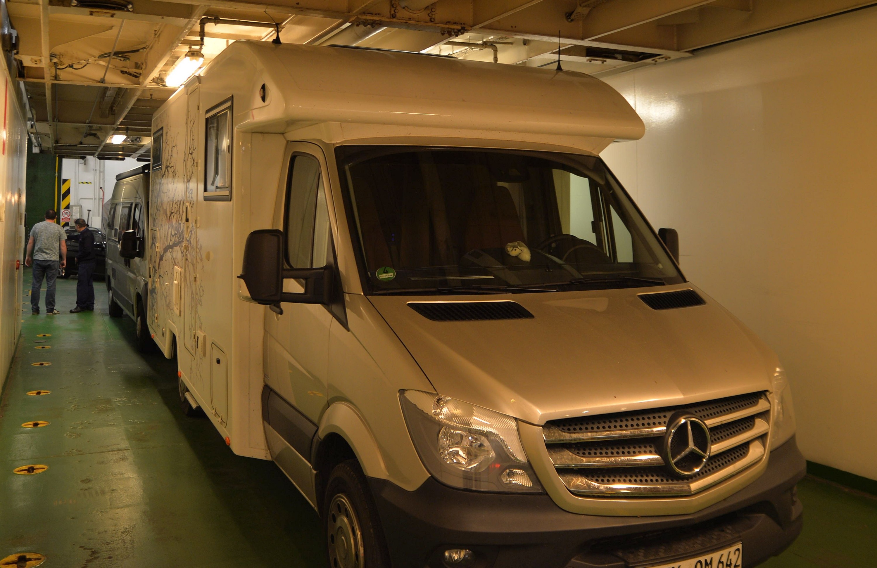 Teilintegrierte sind nicht immer 3m hoch, dieser aber schon. Das hier (Fähre Adrossan-Brodick, Schottland) war ein bisschen sehr knapp (s. rechte Gummiantenne) - das bewegliche Deck über uns wurde dann vor der Ausfahrt hochgezogen Die Gummiantennen als Peilstäbe haben sich jedenfalls bewährt.