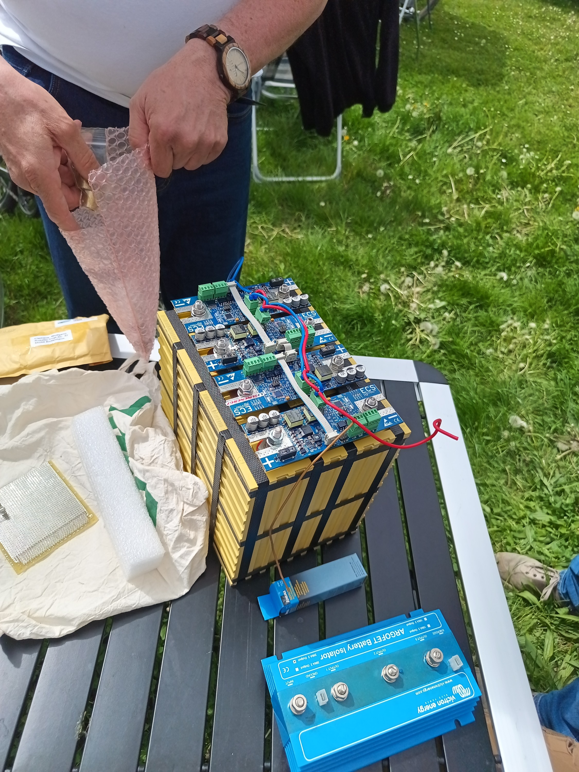 Meine Anfrage an Victron, wie hoch denn die Verlustleistung bei Nennstrom sei - immerhin hat das Teil ja fette Kühlrippen: Paar Watt, ist zu vernachlässigen. Man hatte aber keinen n anderes Gehäuse zur Verfügung. Kühlung sei nicht wirklich notwendig.